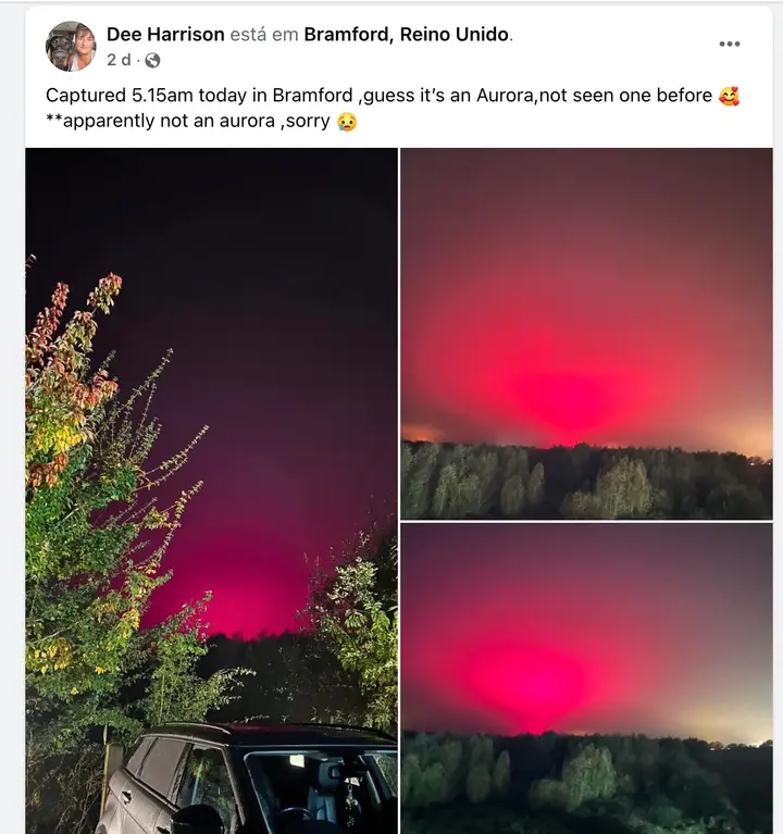 Harrison partilhou três imagens nas redes sociais do que acreditava ser a aurora boreal, com tons intensos de rosa e vermelho. As fotos despertaram a curiosidade de centenas de pessoas, que elogiaram o brilho “impressionante” do céu.