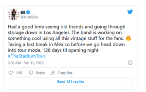 Sixx deixou os seus fãs muito animados, dizendo que estão estão a trabalhar num palco vintag, e que com certeza surpreenderá. Ele disse que está prestes a fazer uma pausa no México antes de irem para a estrada e enfatizou que eles se encontrarão novamente daqui a alguns meses e começaram a contar os dias.