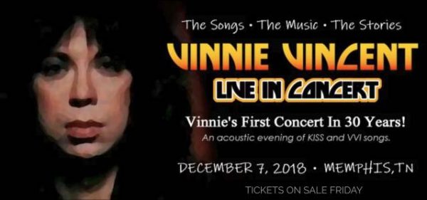 Vinnie Vincent, ex-guitarrista dos Kiss, vai tocar ao pela primeira vez em 30 anos. A performance acontecerá no dia 7 de Dezembro, na cidade de Memphis, nos Estados Unidos, e terá um set acústico com músicas dos Kiss e Vinnie Vincent Invasion.