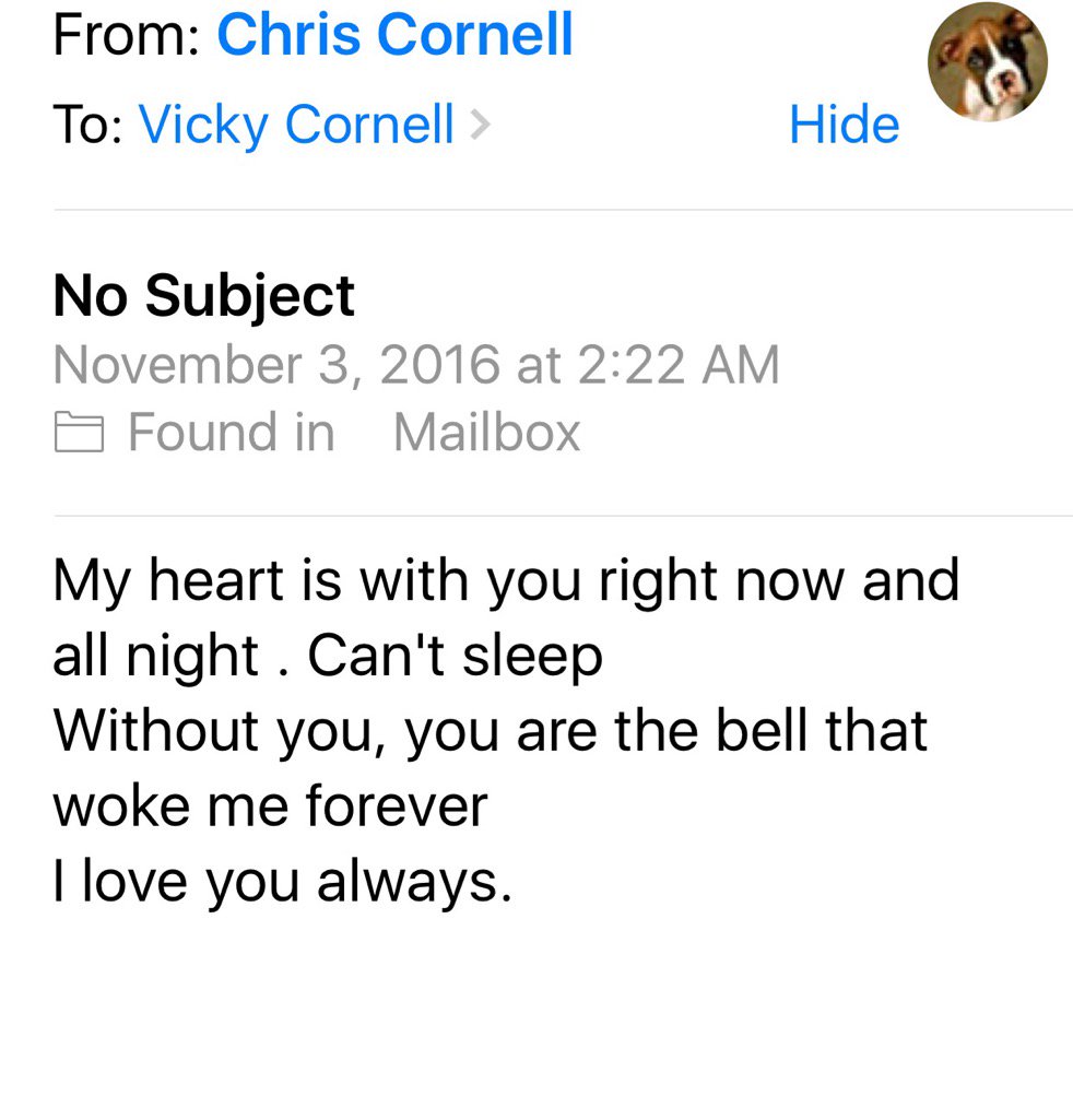 Vicky Cornell, a viúva de Chris, partilhou uma série de imagens e mensagens emocionantes do músico através do seu Twitter. Uma delas, publicada no passado dia 3, foi sobre um e-mail enviado pelo cantor no dia 3 de Novembro do ano passado.